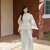 Cổ áo đứng phom kết hợp cùng tay lỡ trẻ trung tạo nên vẻ ngoài chỉn chu. Gam màu trắng tinh khôi giúp tôn lên mọi tông da. Thiết kế này giúp bạn dễ dàng ghi điểm trong mắt người đối diện.